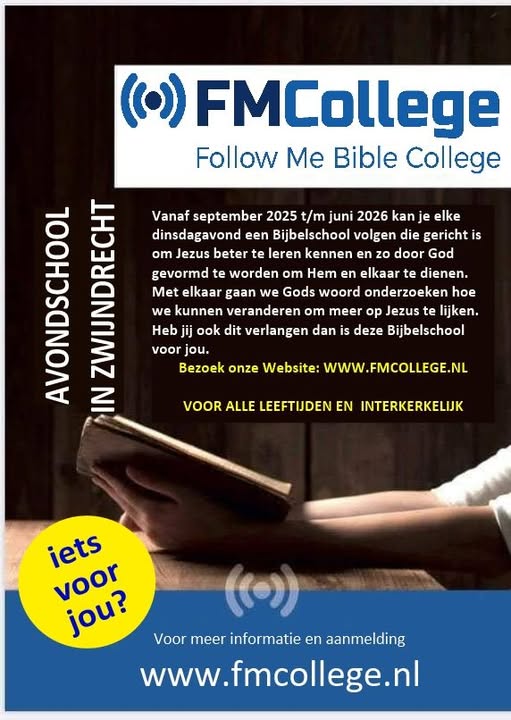 Vanaf dinsdagavond 9 september 2025 tot eind juni 2026 begint de FM Bible College in Zwijndrecht. Elke dinsdagavond wordt, door Dick Pieterman, Willem Biesheuvel en anderen, verdiepend en praktisch Bijbelonderwijs gegeven. De school richt zich voornamelijk op deze kernwaarden: het leren kennen van God, karaktervorming en discipelschap. Schrijf je nu in via www.fmcollege.nl of meld jezelf aan voor de open avond op dinsdagavond 9 september via info@fmcollege.nl.